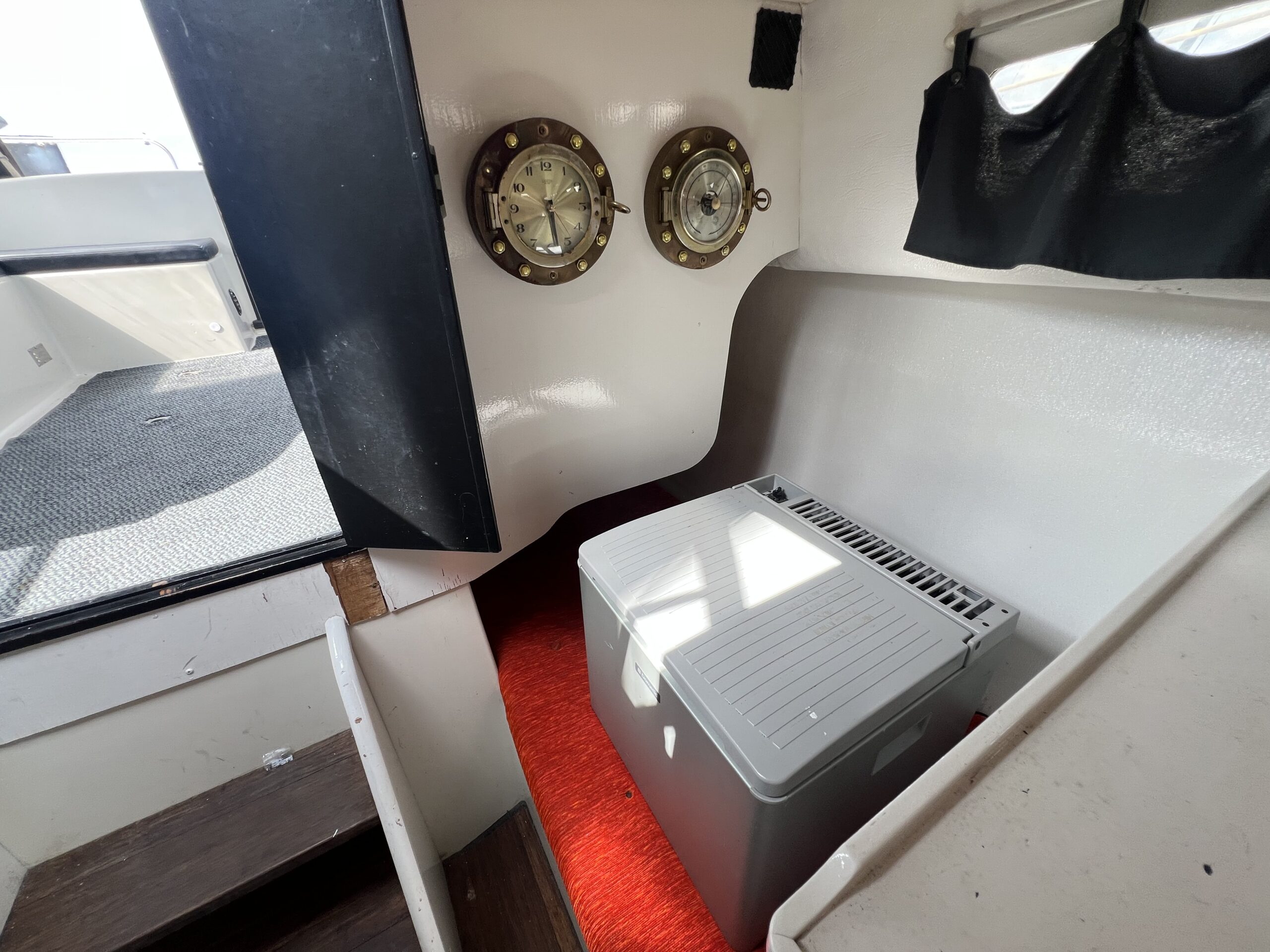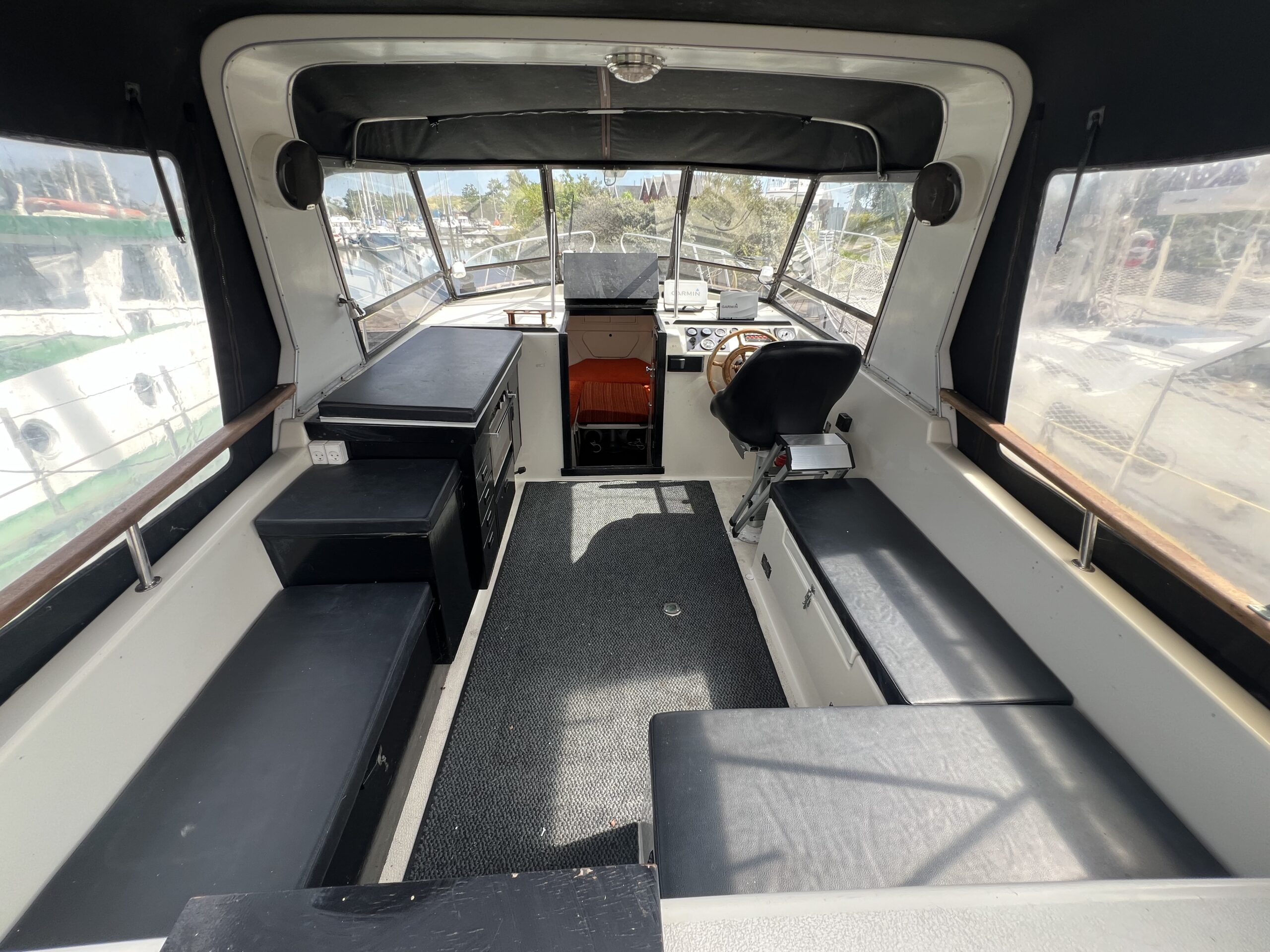 Familieturbåd med dieselmaskine og fast aksel sikre god økonomi og alligevel med fart nok til at komme hjem til tiden. Cockpit med pantrysektion. Føreplads og dobbelt passagerstol som kan vendet “på hovedet” således at den indgår i siddegruppe med bord midt i cockpittet. Adgang til fin agterkahyt med stor dobbeltkøje og skabsarrangement. Fremme er hovedkahyt med stor sofagruppe med bordløsning som kan omgøres til stor dobbeltkøje. Toiletrum med vaskemodul. Yderligere fin stikkøje i BB side under cockpit giver båden hele 5 rigtig fine sovepladser.