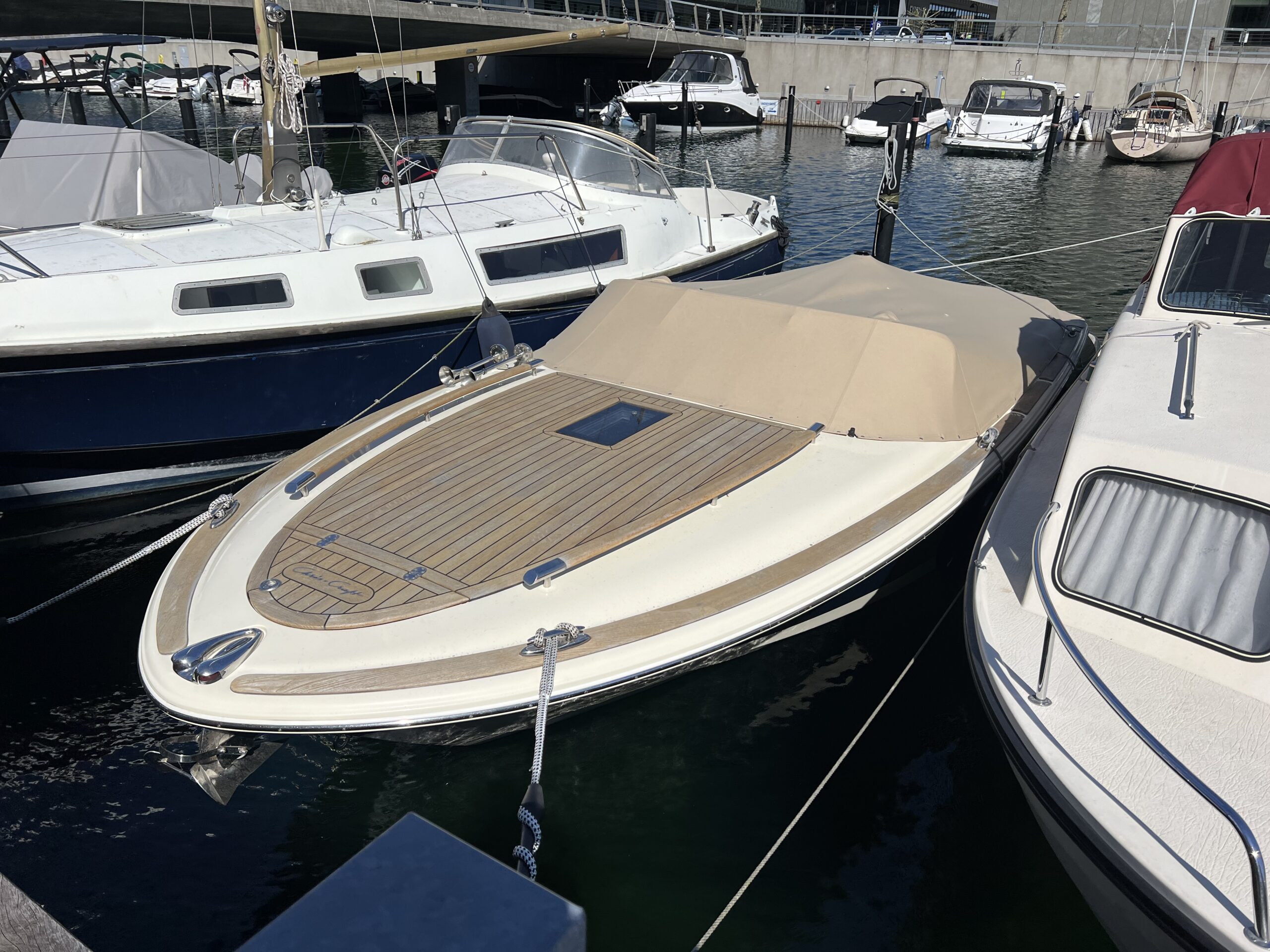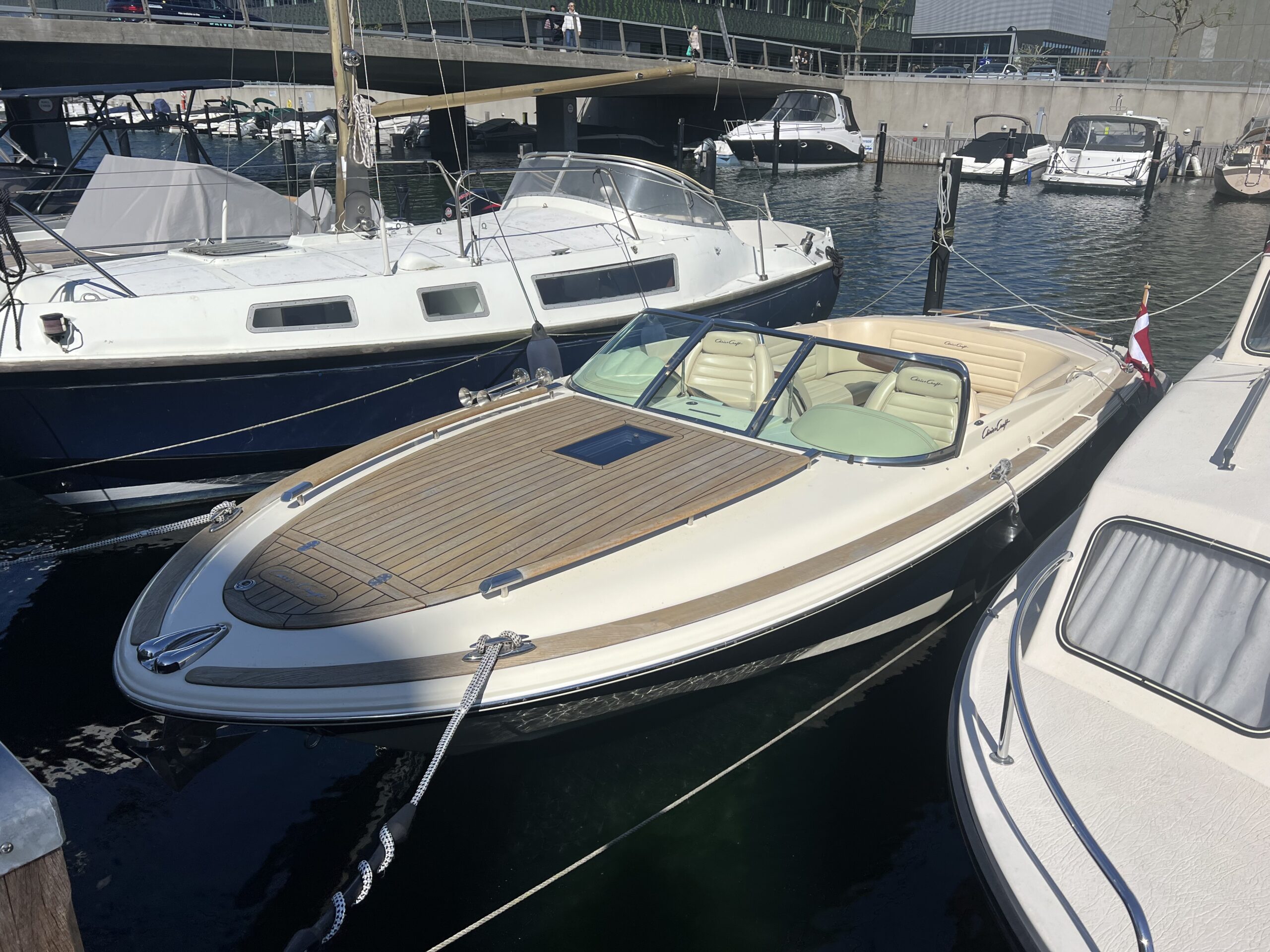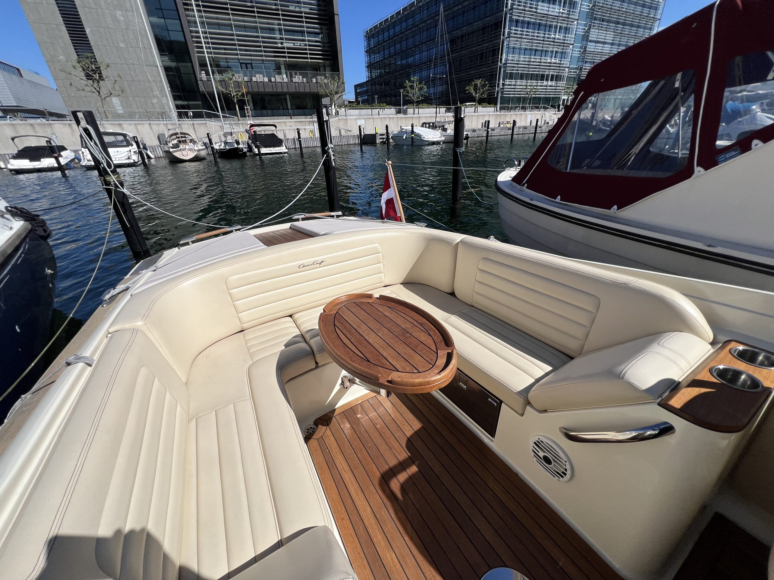 som en Chris Craft skal, stået opbevaret indendørs om vinteren. Plads til 2 sovende personer i kahytten. Stor U-Sofa i cockpit med plads til alle vennerne eller familien. Den