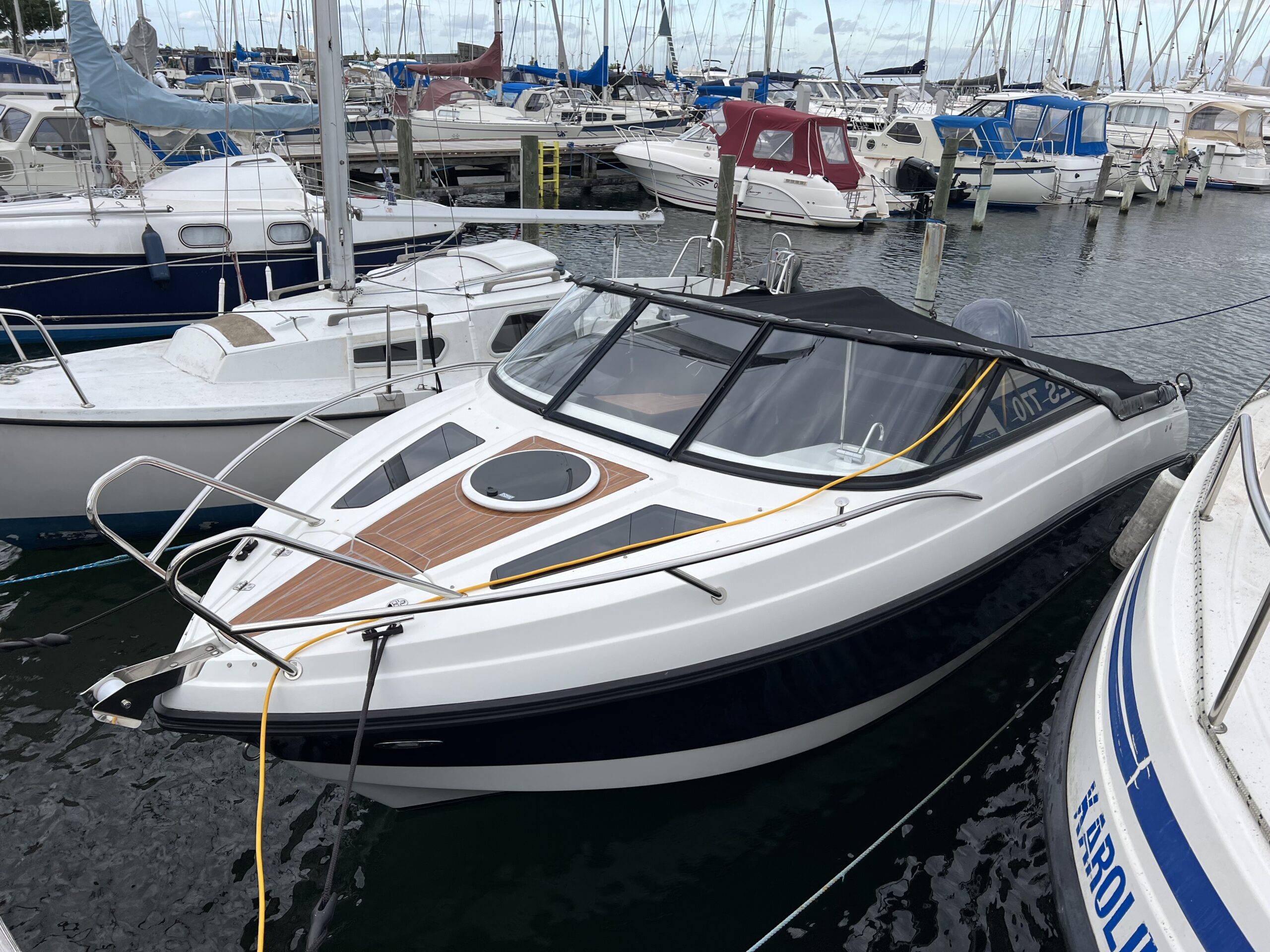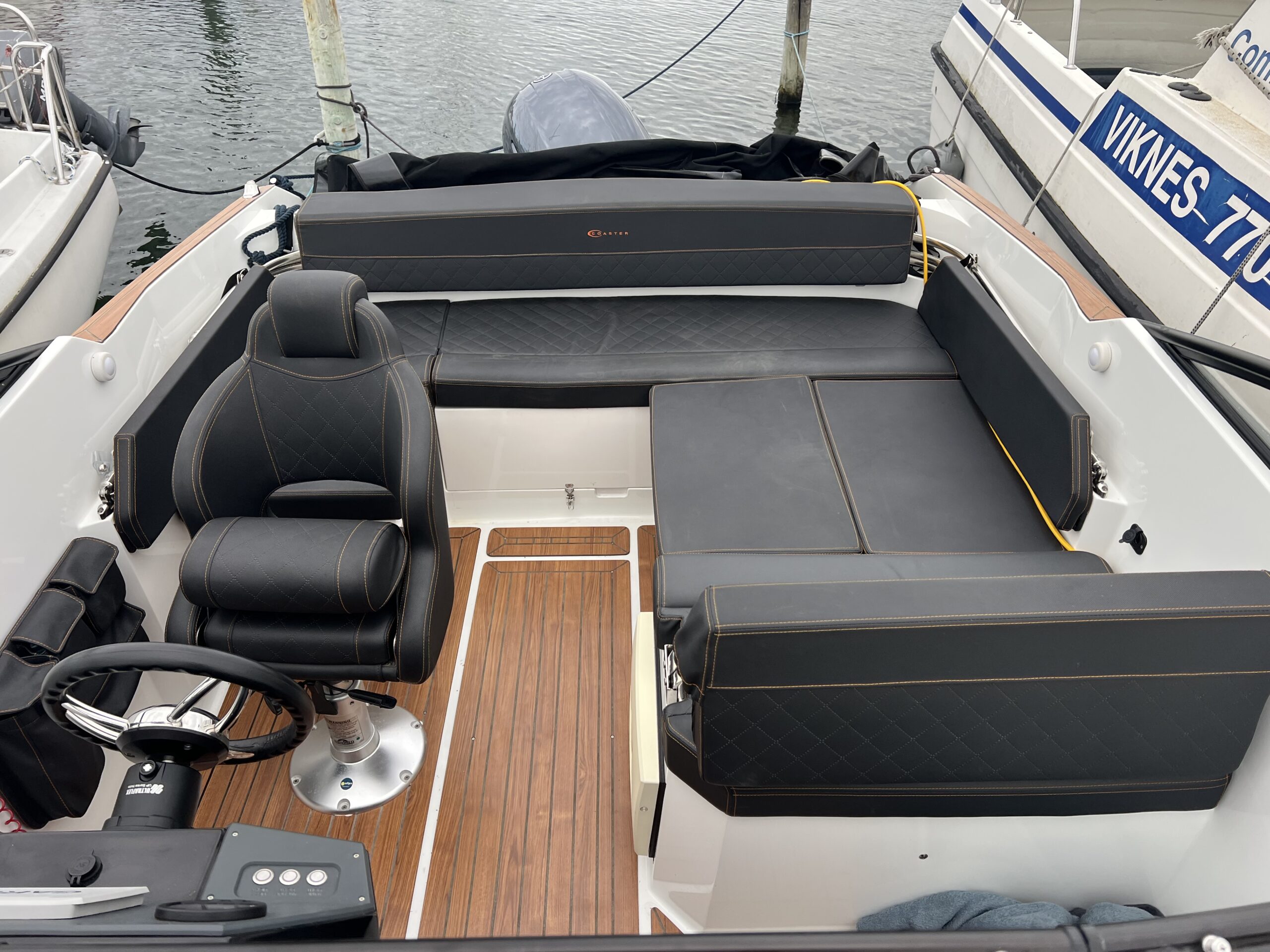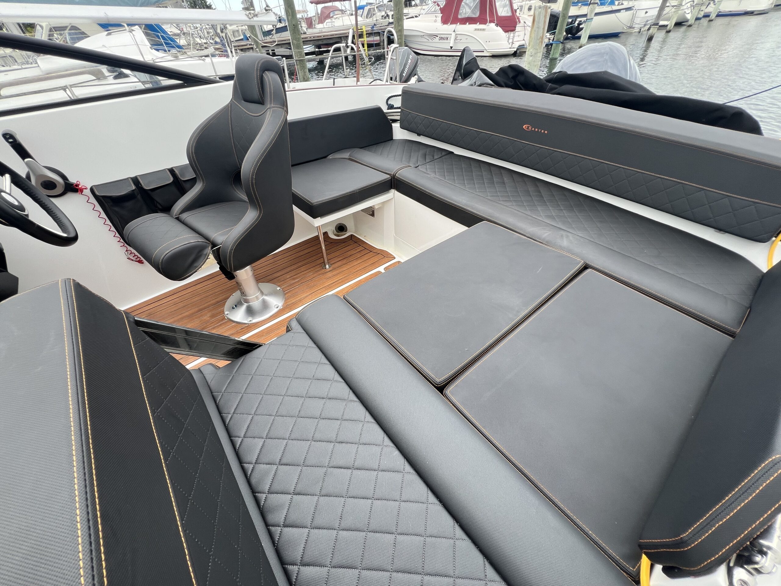 Drømmer du om at kunne tage vennerne, eller familien med på tur og se den danske sommer fra havsiden, så er Coaster 600 DC et godt bud på en fin daycruiser – endda med overnatningsmulighed for 2 voksne. Velindrettet og velfungerende cockpit. Agtersofa med integreret kaleche-garage som gør det let at op- og nedtage kalechen. I bagbord er yderligere 1½ personers siddeplads, hvor ryggen kan vippes. Dette giver mulighed for at sidde omkring et bord, og ikke mindst giver det også muligheden for at omdanne hele området til en solseng. Førersædet er vendbart så det kan “deltage” i sofahyggen. Nedgang til fin hyggelig kahyt således at når trætheden melder sig han kaptajnen og princessen sove skønhedssøvn. Båden har fået alt ekstraudstyr hvor der bør fremhæves, teakdørk-look, camper kaleche, toiletløsning, hynder overalt, LED lys køleskuffe deluxehynder, og den store 150 Hk Yamaha
