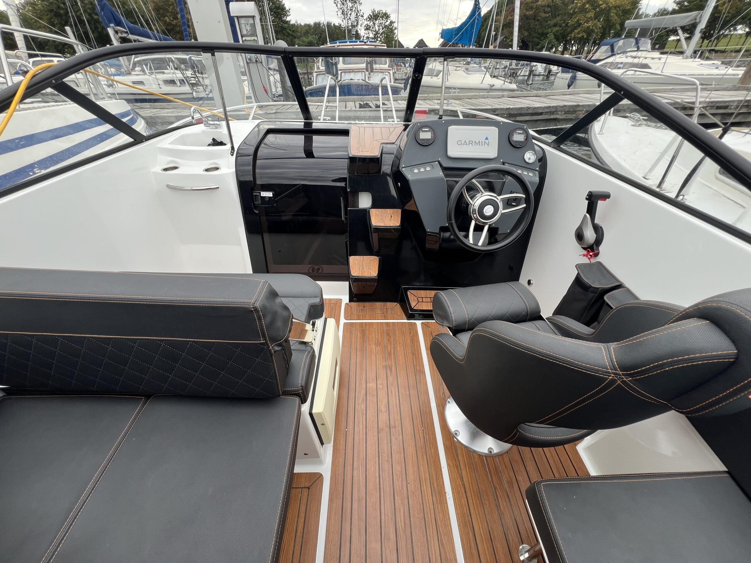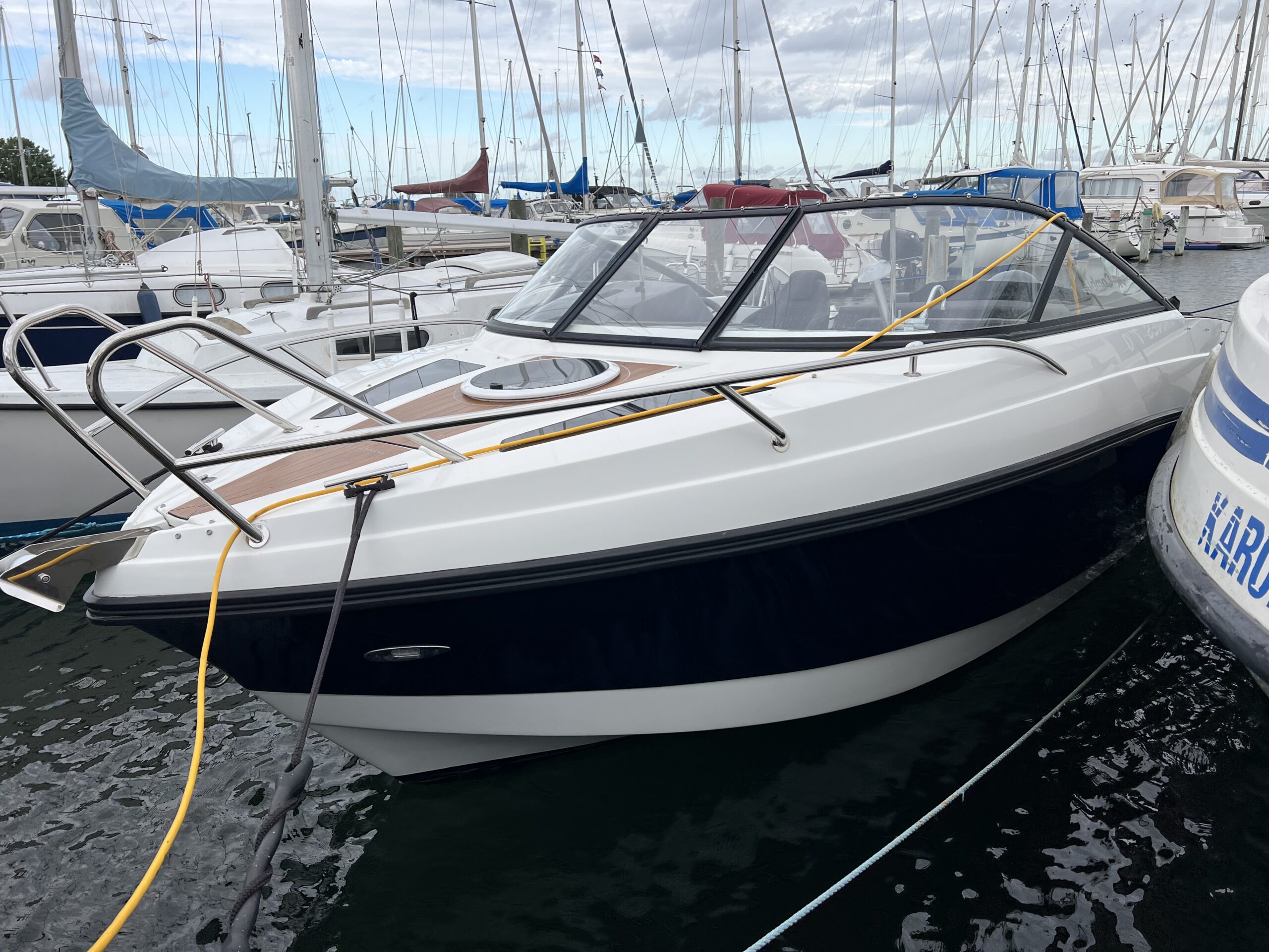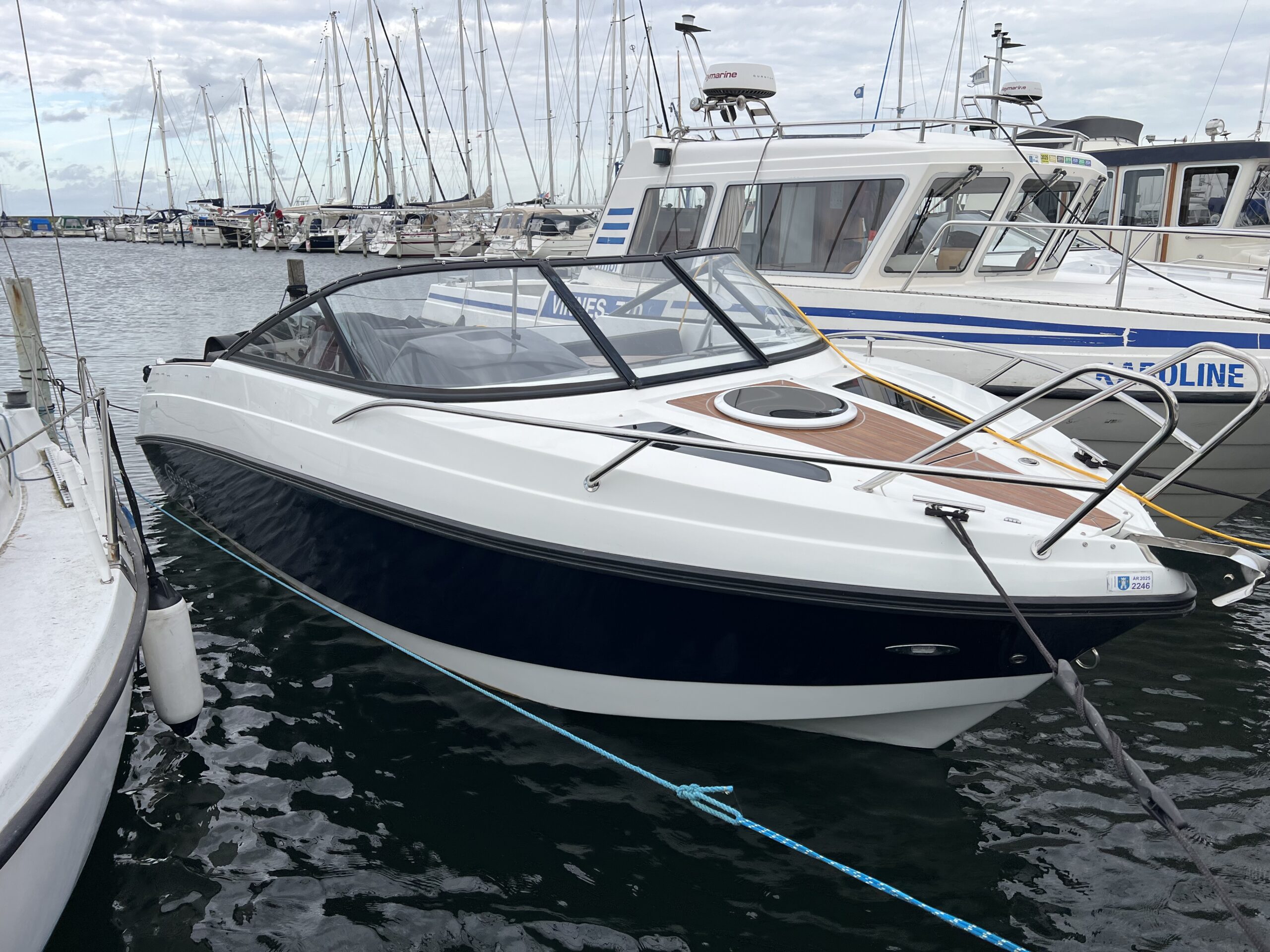 Drømmer du om at kunne tage vennerne, eller familien med på tur og se den danske sommer fra havsiden, så er Coaster 600 DC et godt bud på en fin daycruiser – endda med overnatningsmulighed for 2 voksne. Velindrettet og velfungerende cockpit. Agtersofa med integreret kaleche-garage som gør det let at op- og nedtage kalechen. I bagbord er yderligere 1½ personers siddeplads, hvor ryggen kan vippes. Dette giver mulighed for at sidde omkring et bord, og ikke mindst giver det også muligheden for at omdanne hele området til en solseng. Førersædet er vendbart så det kan “deltage” i sofahyggen. Nedgang til fin hyggelig kahyt således at når trætheden melder sig han kaptajnen og princessen sove skønhedssøvn. Båden har fået alt ekstraudstyr hvor der bør fremhæves, teakdørk-look, camper kaleche, toiletløsning, hynder overalt, LED lys køleskuffe deluxehynder, og den store 150 Hk Yamaha