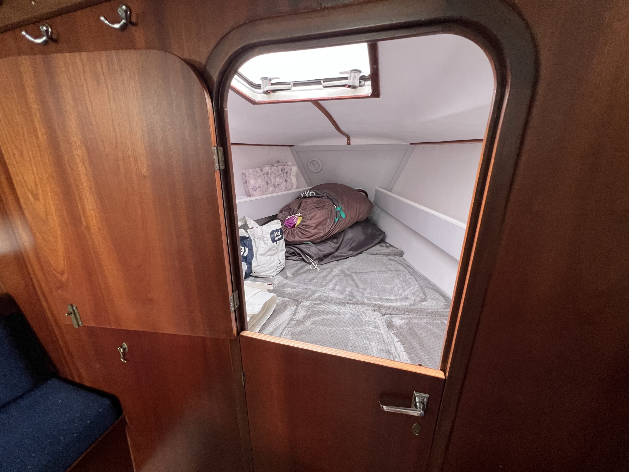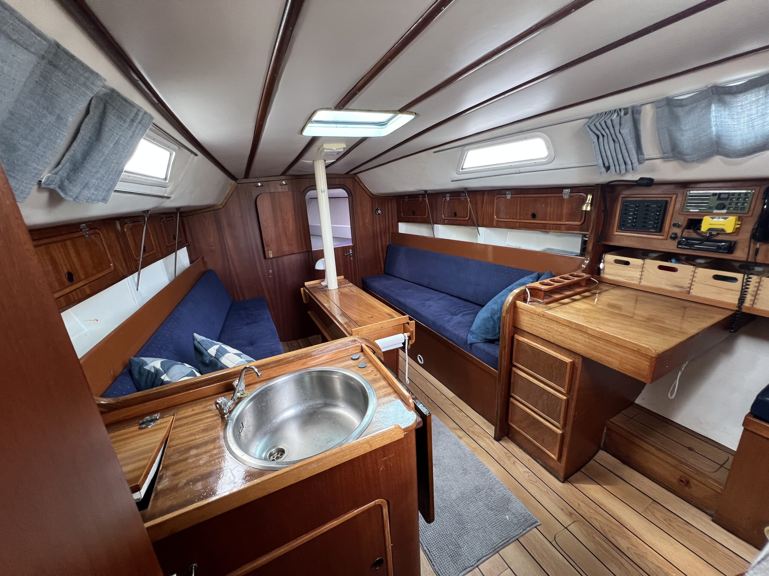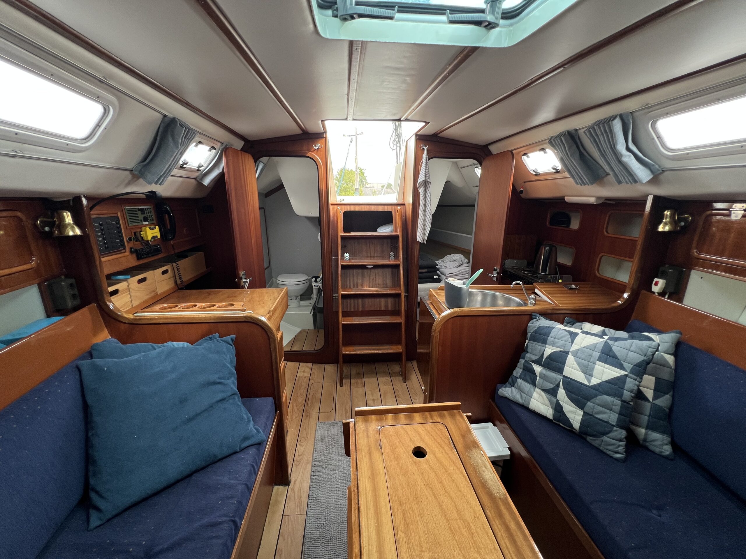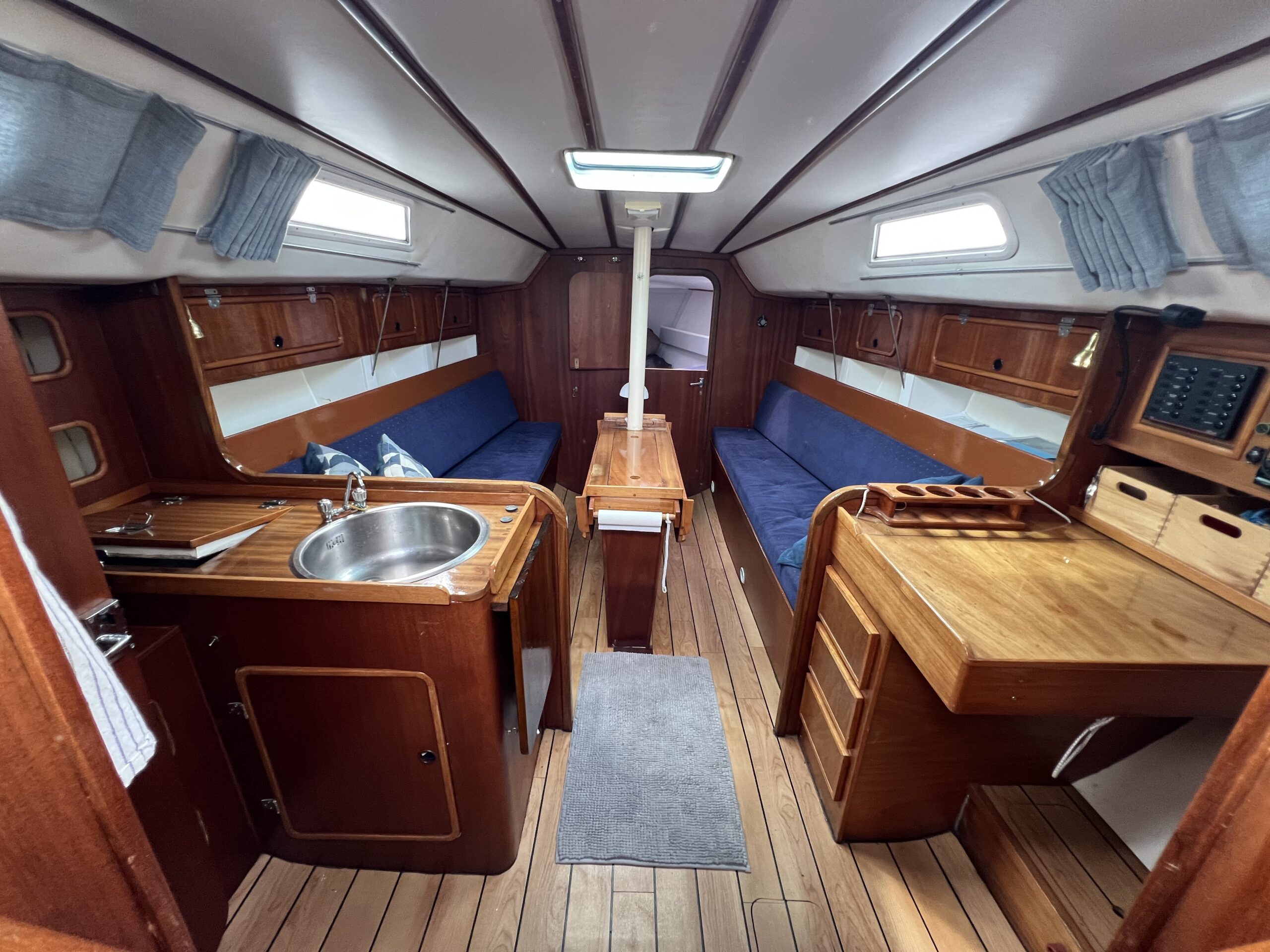 Ved nedgangen til kahytten mærker man straks kvaliteten og den flotte aptering. Her findes et velindrettet pantry, et kortbord, en agterkahyt i bagbord side samt et stort og rummeligt toiletrum i styrbord side. Foran, gennem en todelt dør, er der en fin dobbeltkøje.