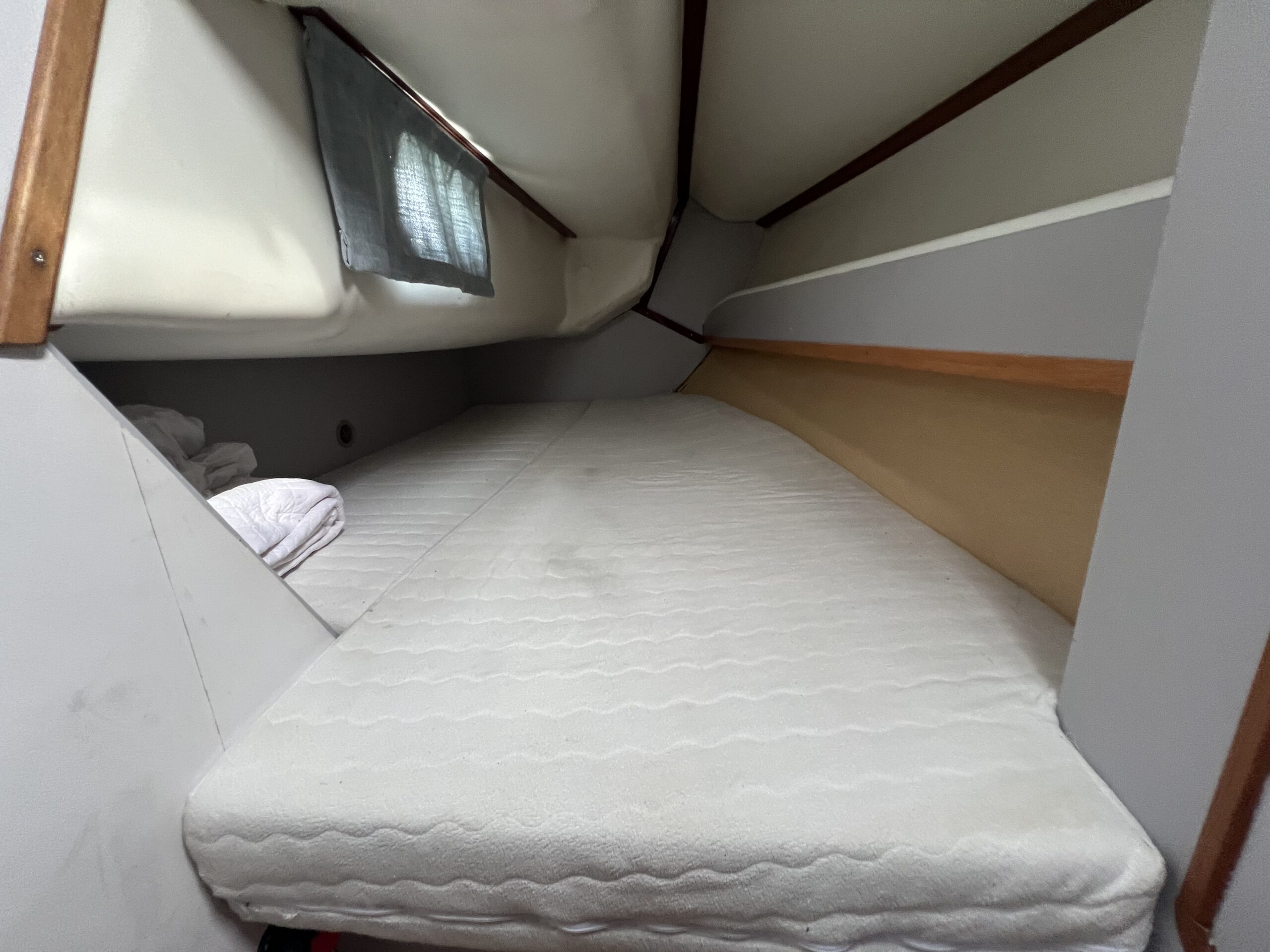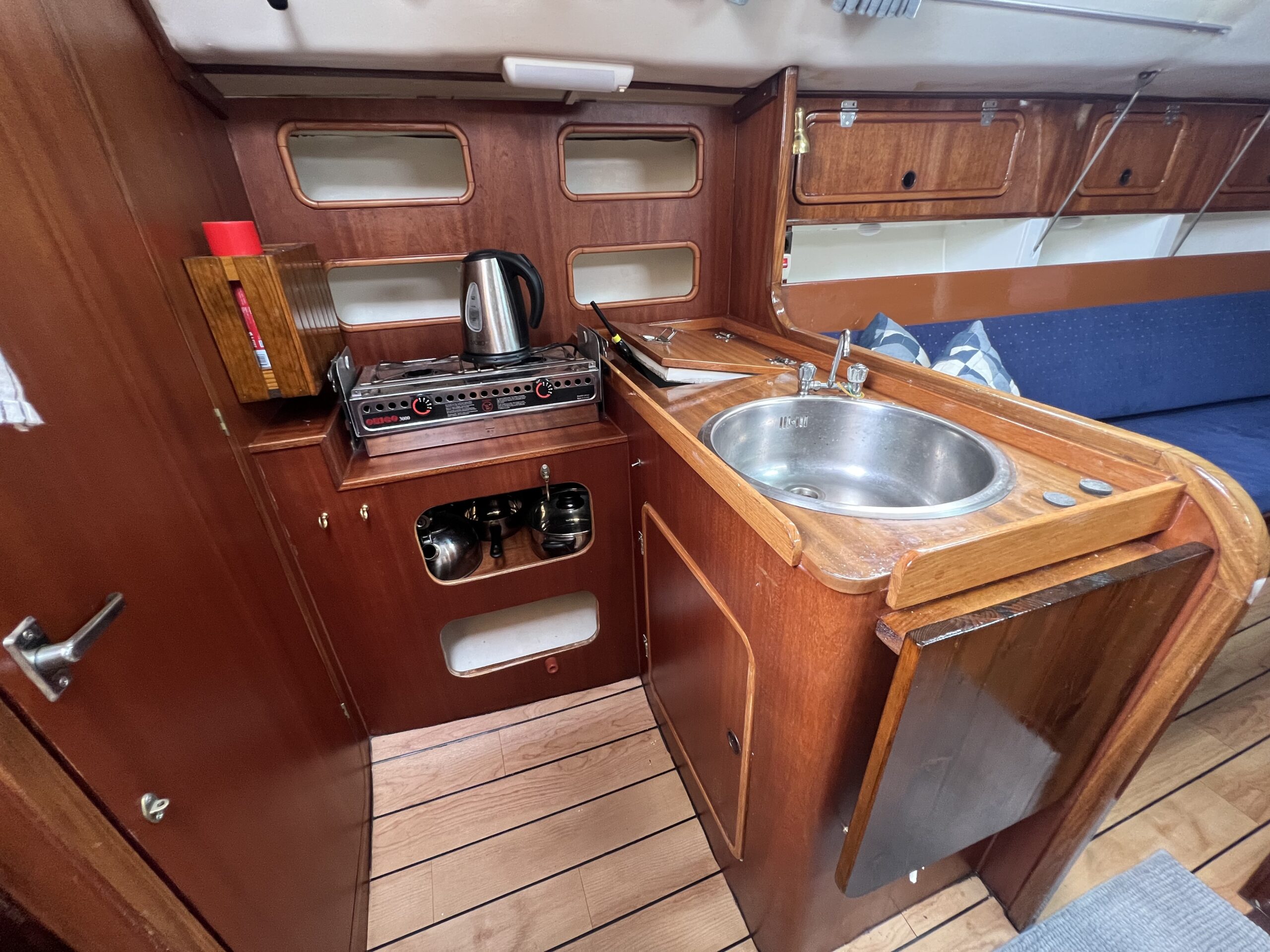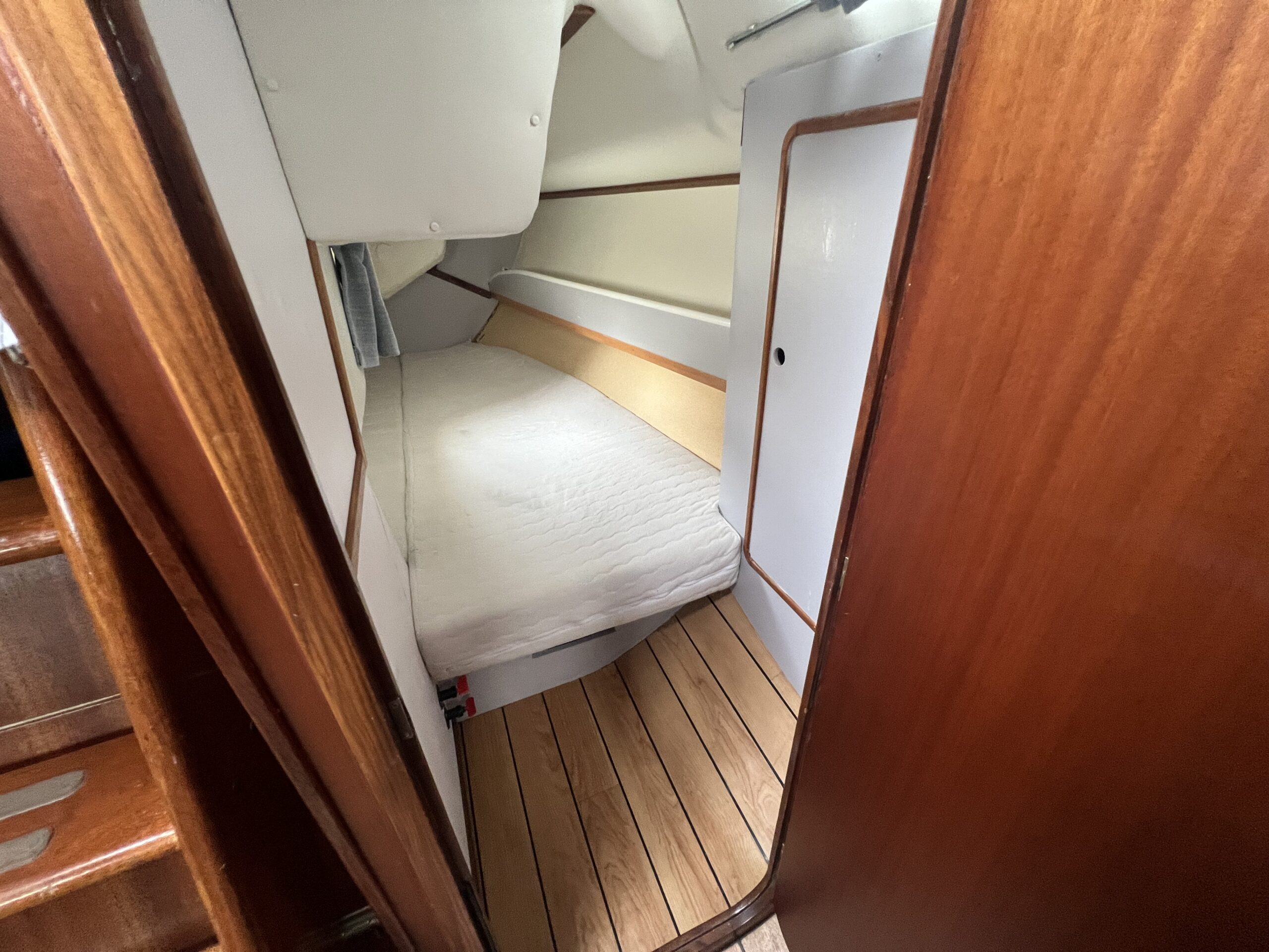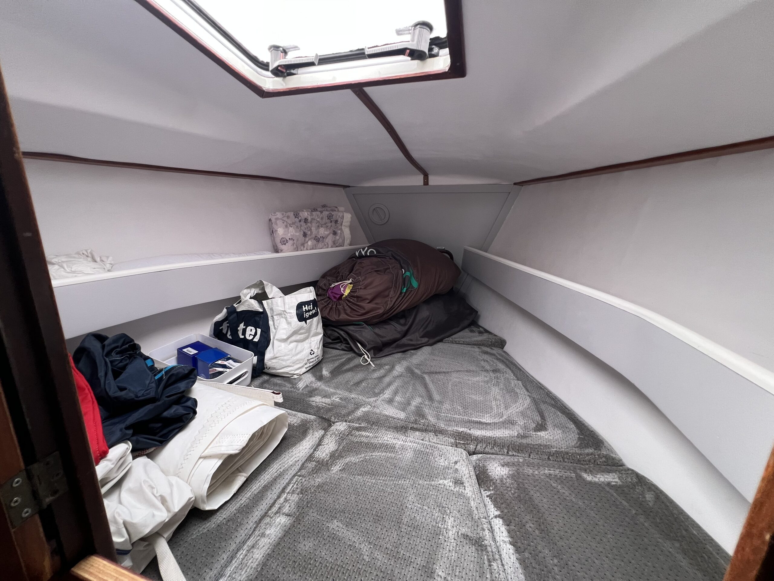 Ved nedgangen til kahytten mærker man straks kvaliteten og den flotte aptering. Her findes et velindrettet pantry, et kortbord, en agterkahyt i bagbord side samt et stort og rummeligt toiletrum i styrbord side. Foran, gennem en todelt dør, er der en fin dobbeltkøje.