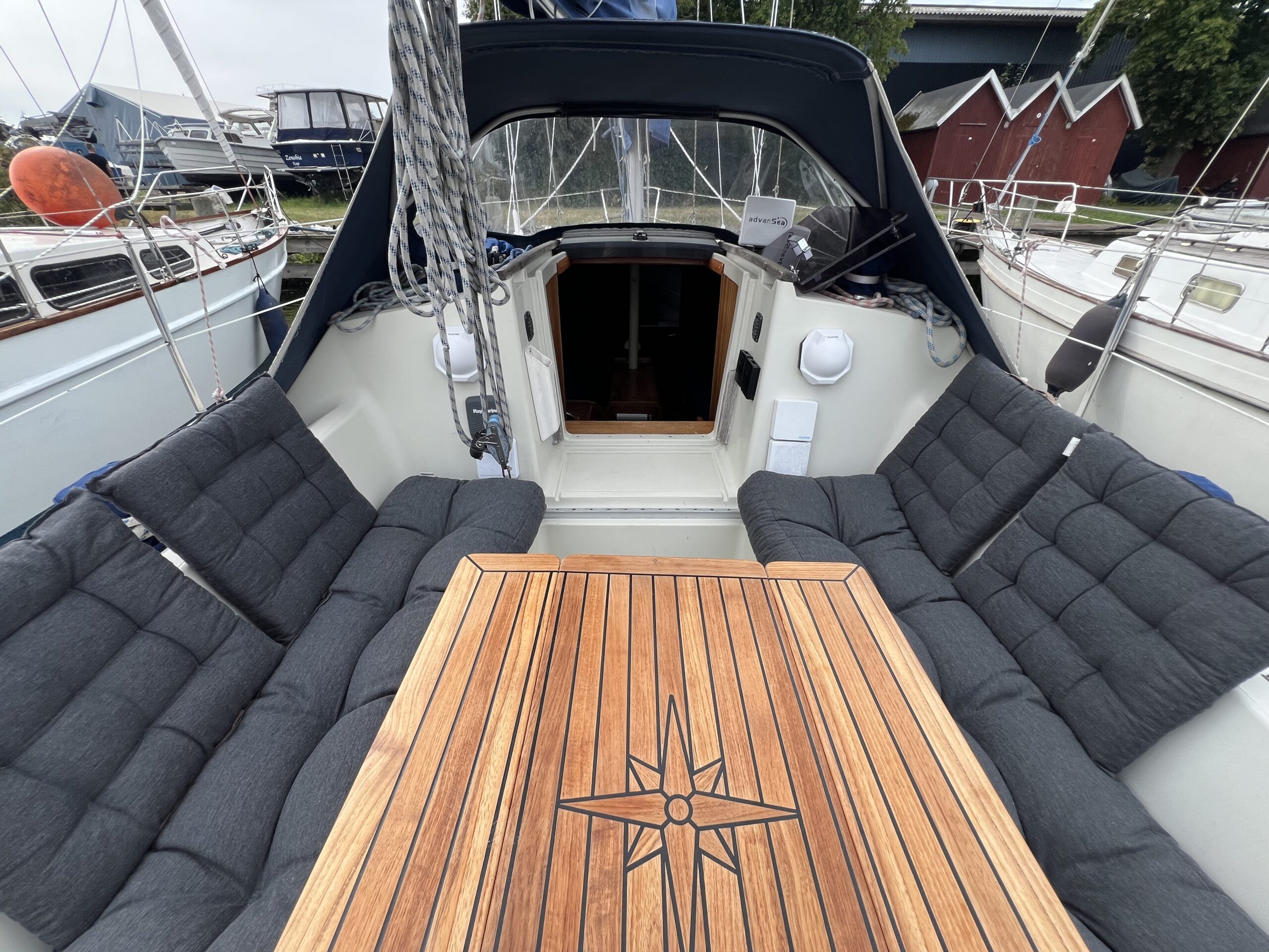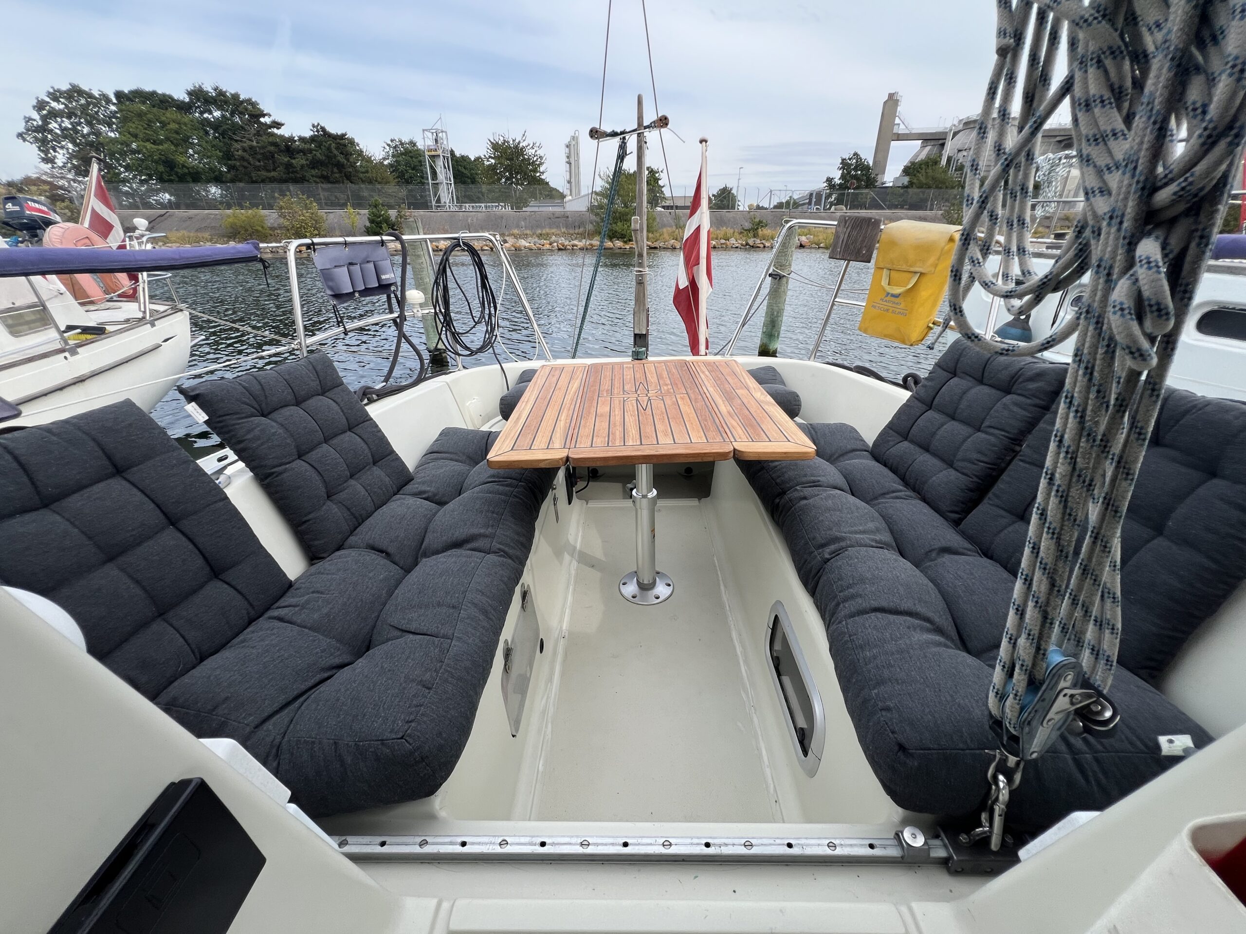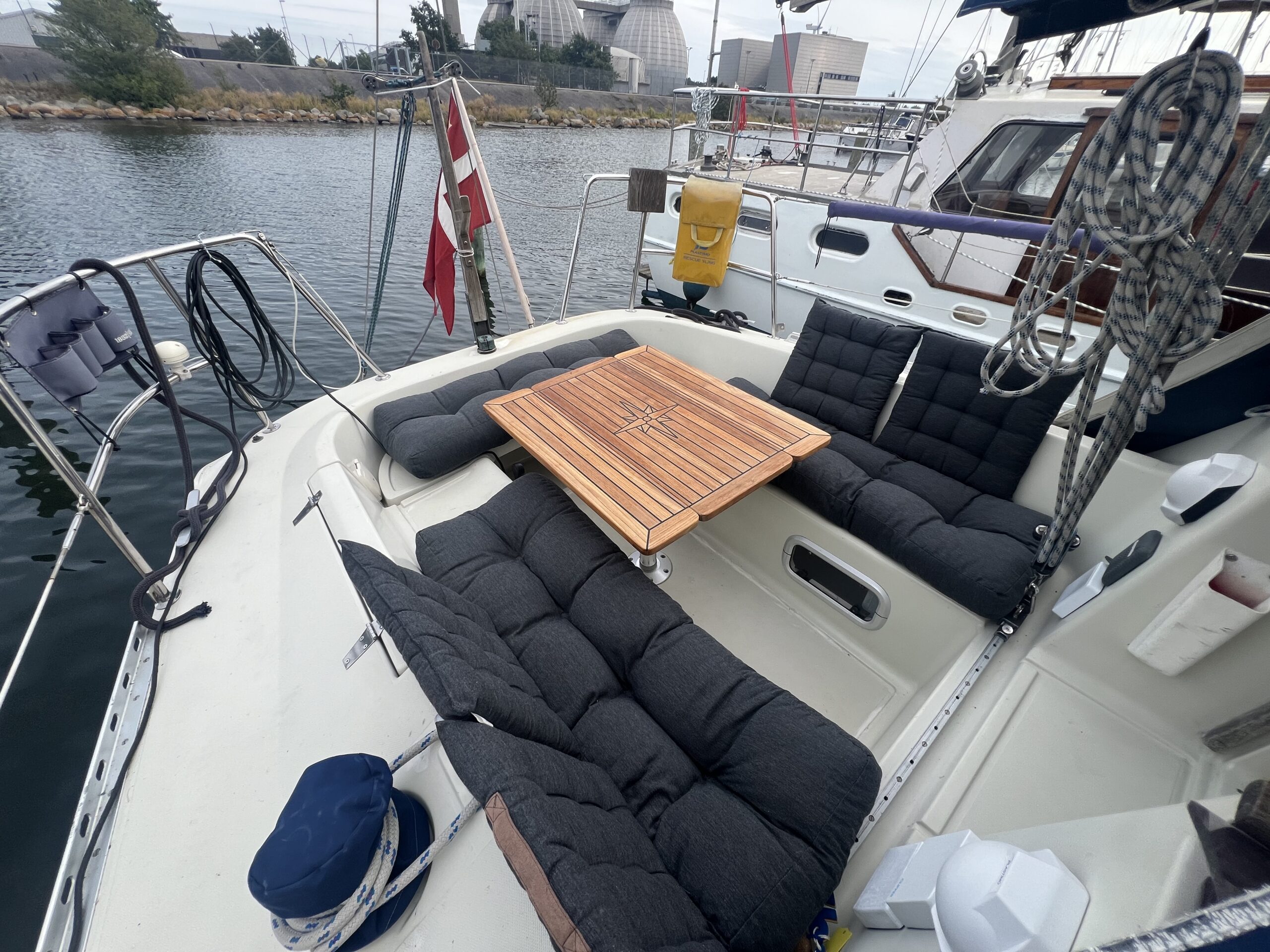 I cockpittet kan man nemt sidde seks personer rundt om det smukke teakbord, og den integrerede badeplatform giver nem adgang til og fra båden, når man ligger til anker. Alle fald er ført til cockpittet.