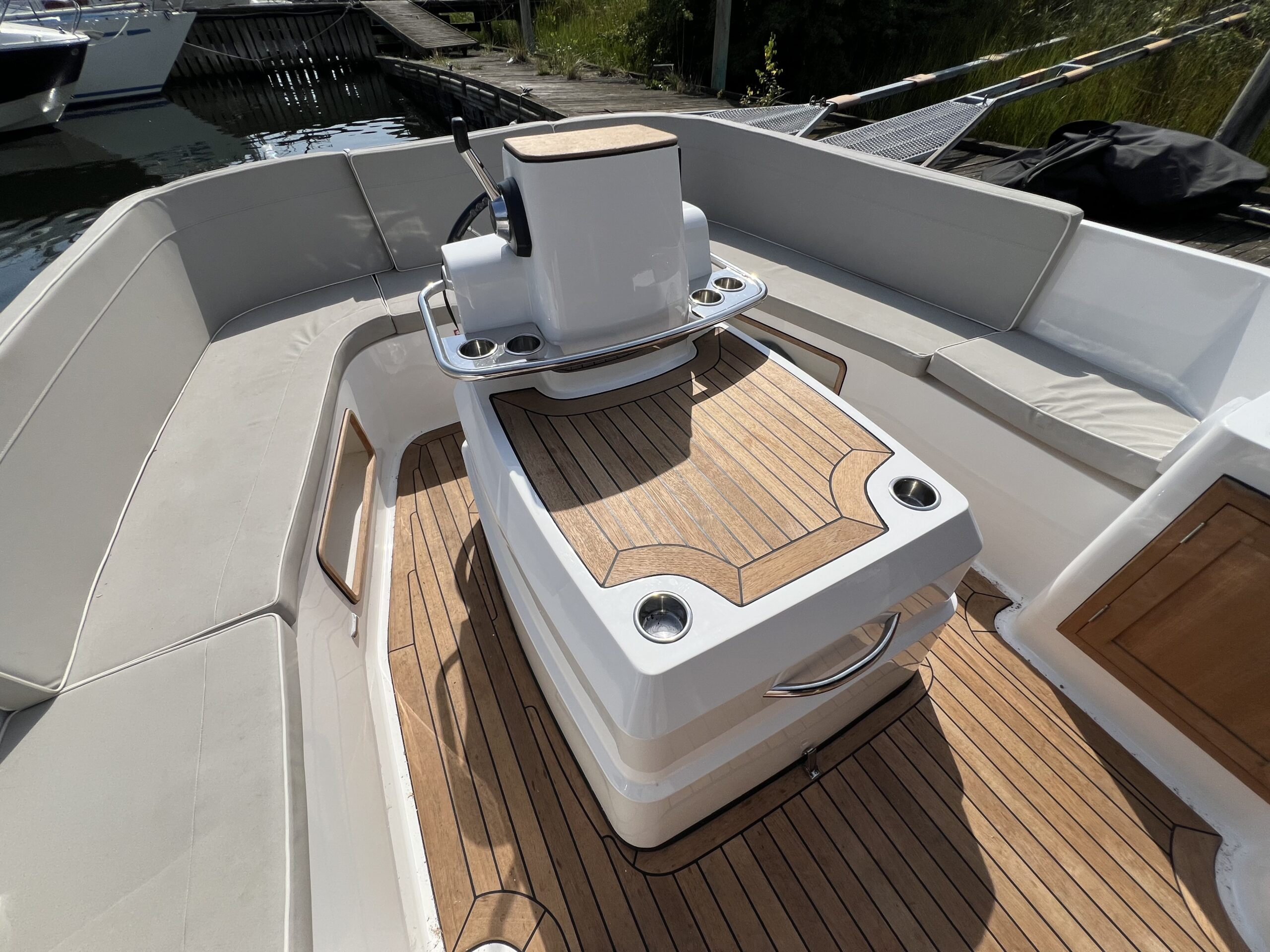 | • Kopholder, opbevaring og instrumentbøjle i rustfri | • Teak på indgangstrin |
