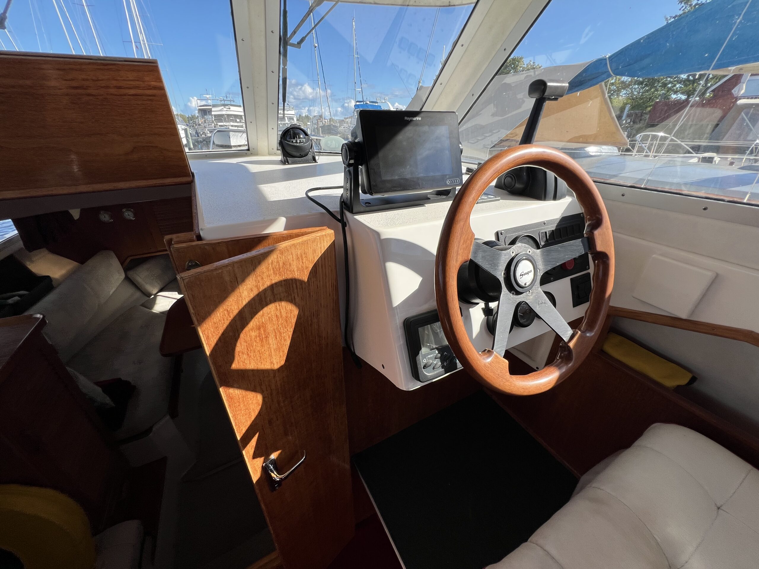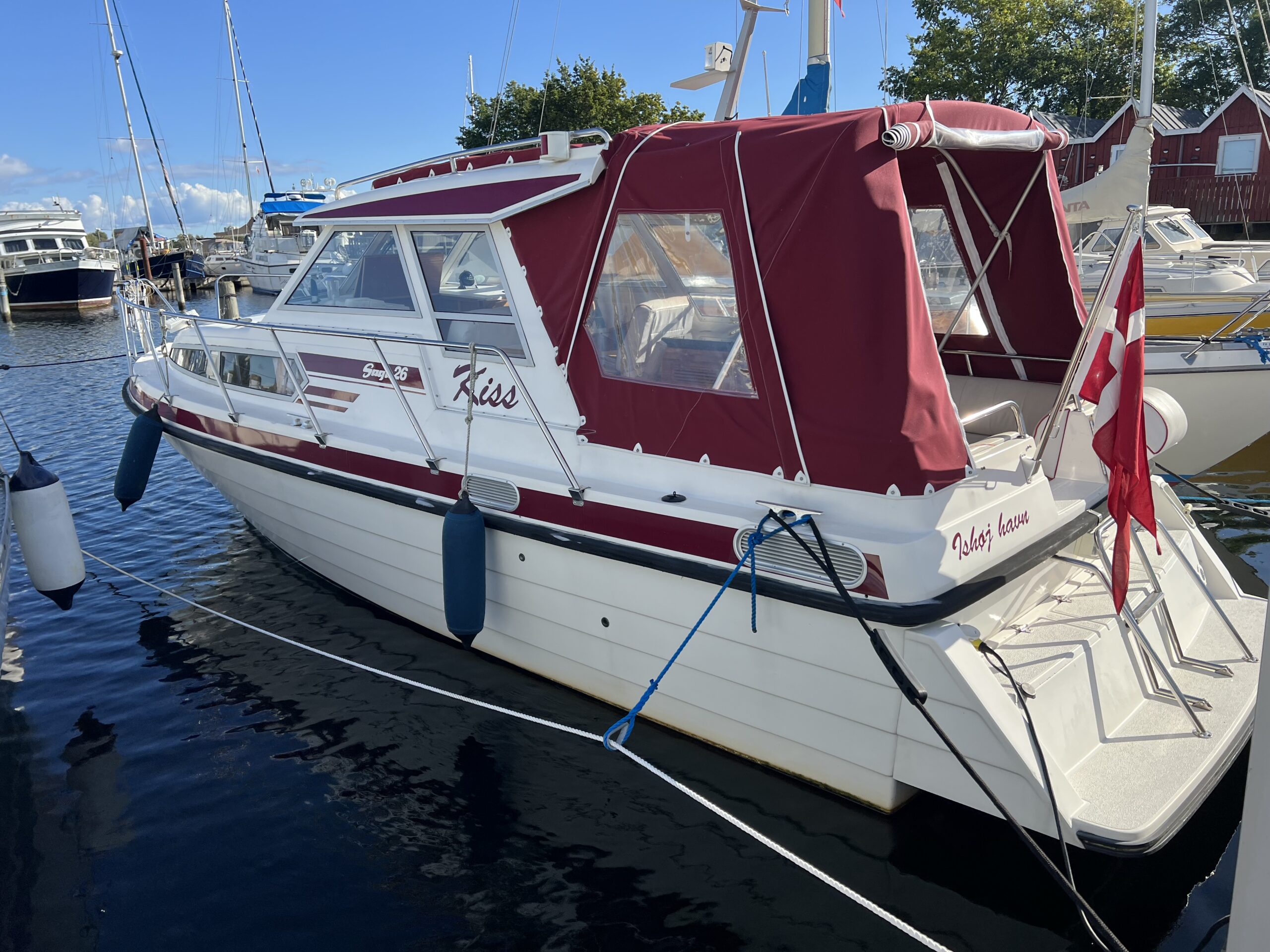 Velholdt Saga 26 HT med fast skrueaksel og Bovpropel. Dansk båd fra ny. Saga 26 HT er halvplanende og man mærker kvalitet og godt håndværk overalt i båden. Denne model er specielt kendt for sit store cockpit med mange siddepladser, Båden har en fin kahyt med 3 rigtig gode sovepladser og et aflukket toiletrum. Båden har haft 2 ejere før nuværende og der er siden 2002 lavet en komplet udførlig logbog på hvad der blevet lavet hvert år, lige fra Frostsikring af vandsystem til hvor mange gang lak der givet på kistebænk. Det er en fornøjelse af se, og der er virkelig blevet passet godt på denne båd og motor hele dens liv. også mange fornyelser er kommet til med tiden, Original kaleche fra Saga, Kortplotter fra Raymarine, Køleskab, stafferinger, osv. Alt i alt en virkelig fin og velholdt Saga 26 HT